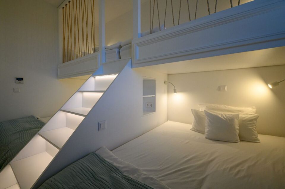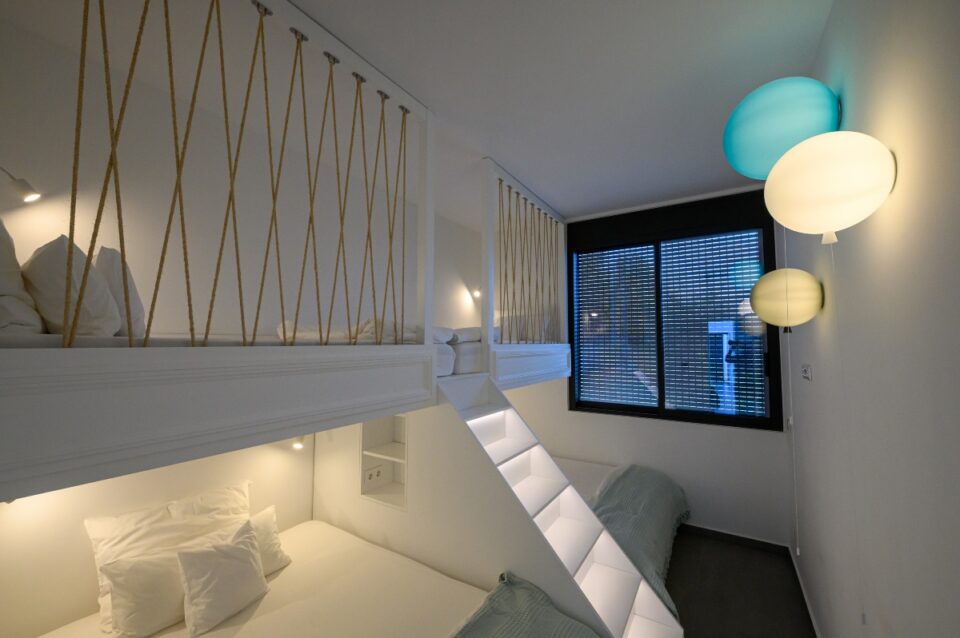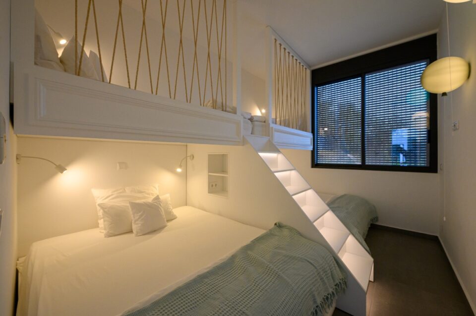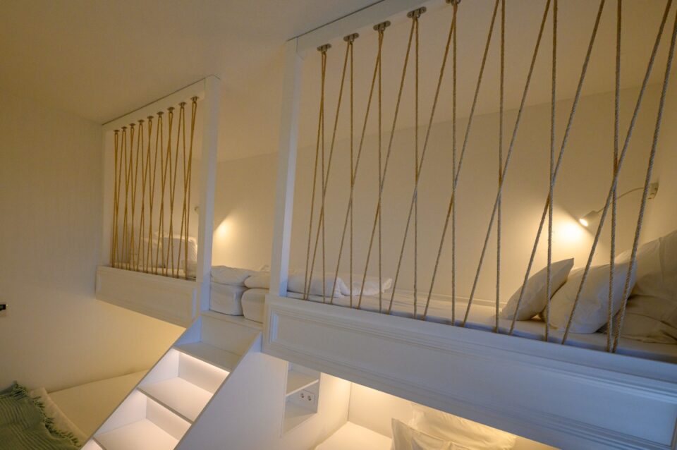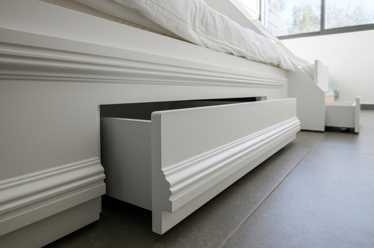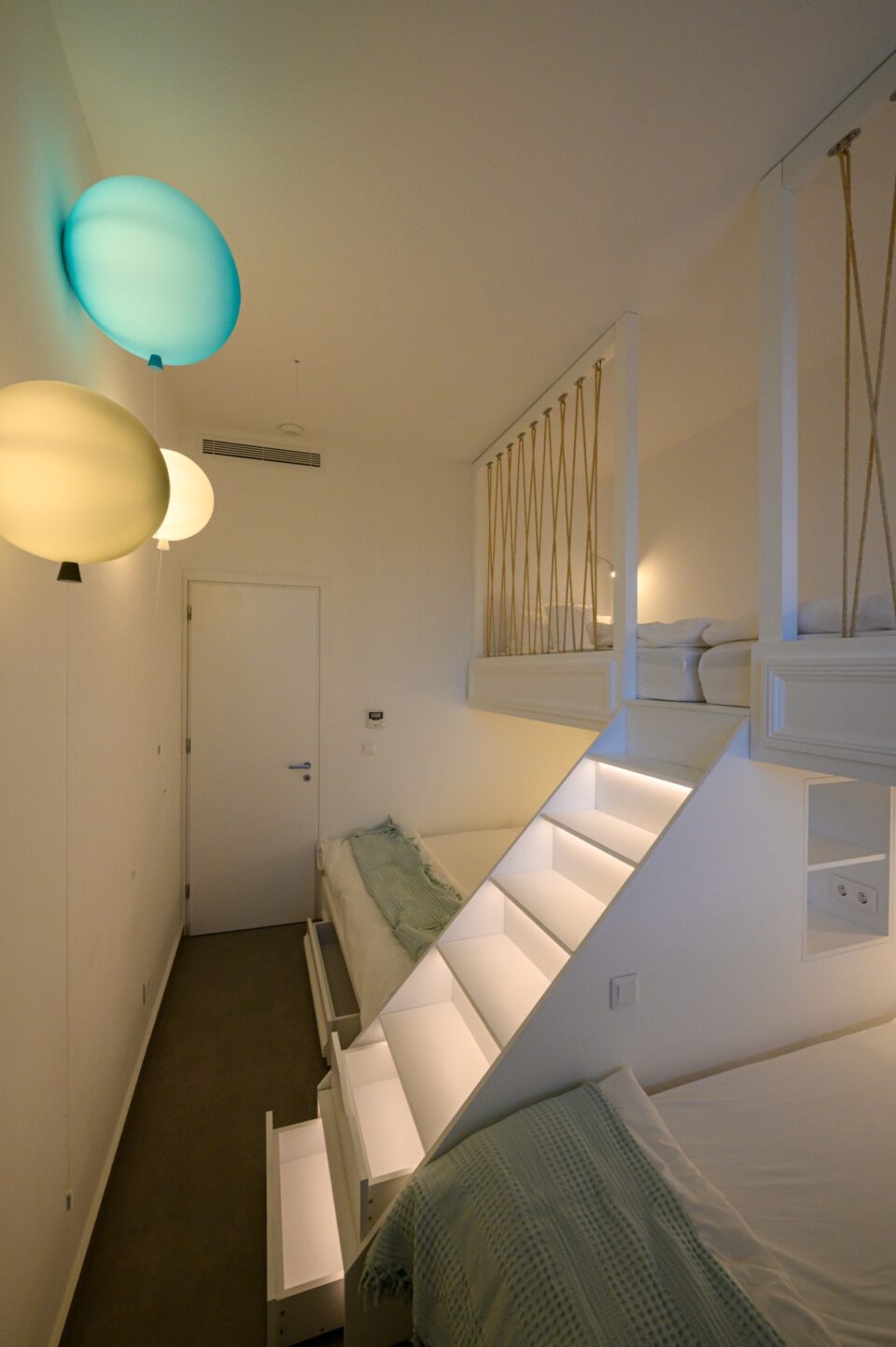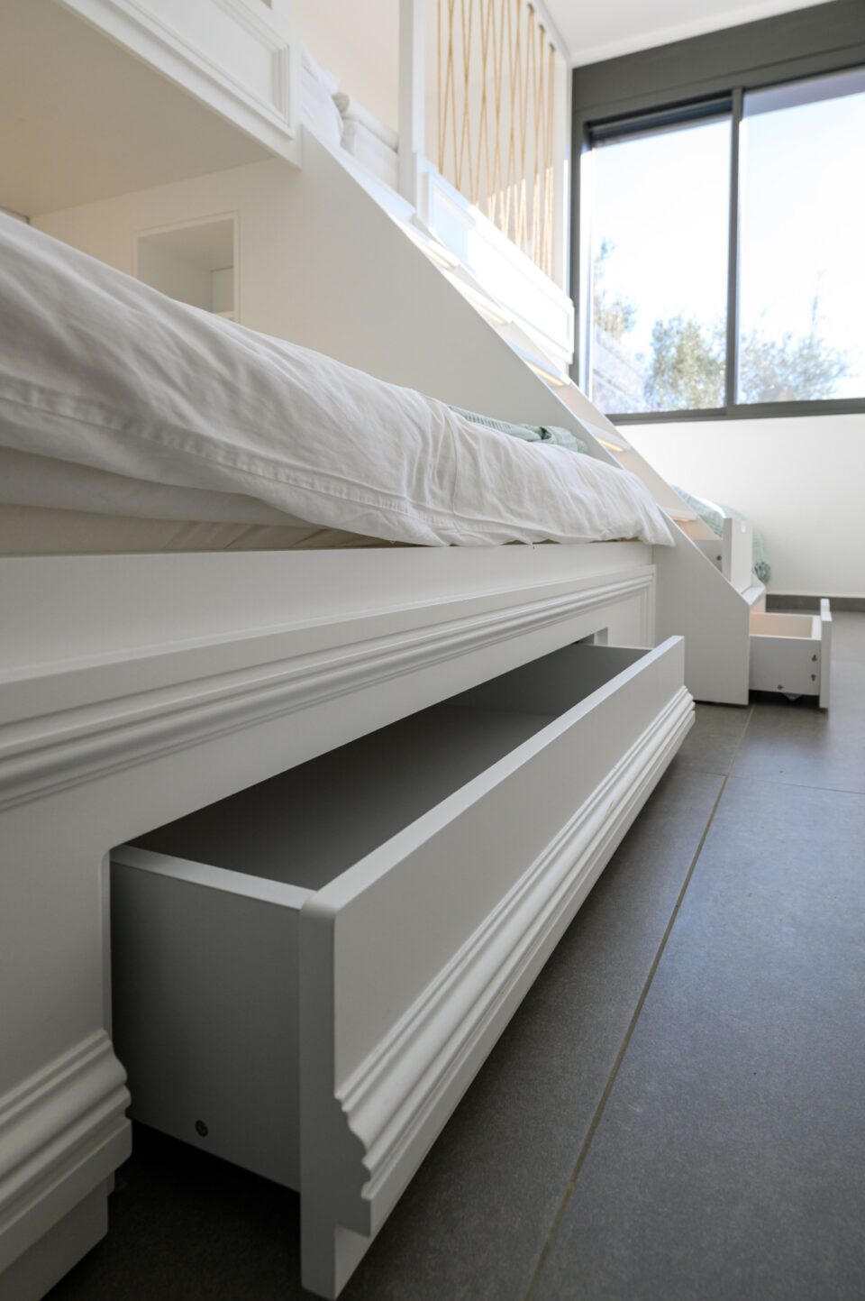 As for the established "sleep over" parties of our youngest clients, we made sure that the lower part of their beds opened telescopically, thus revealing two more beds for more space!!!
