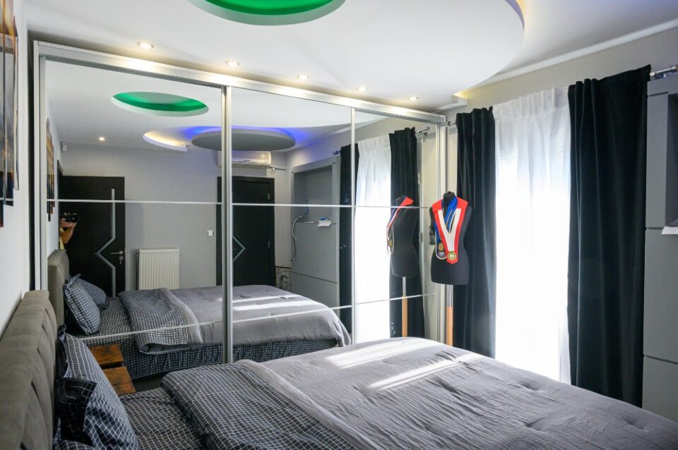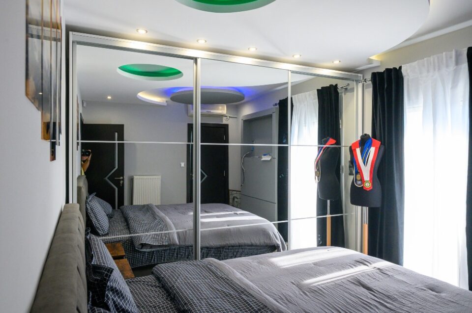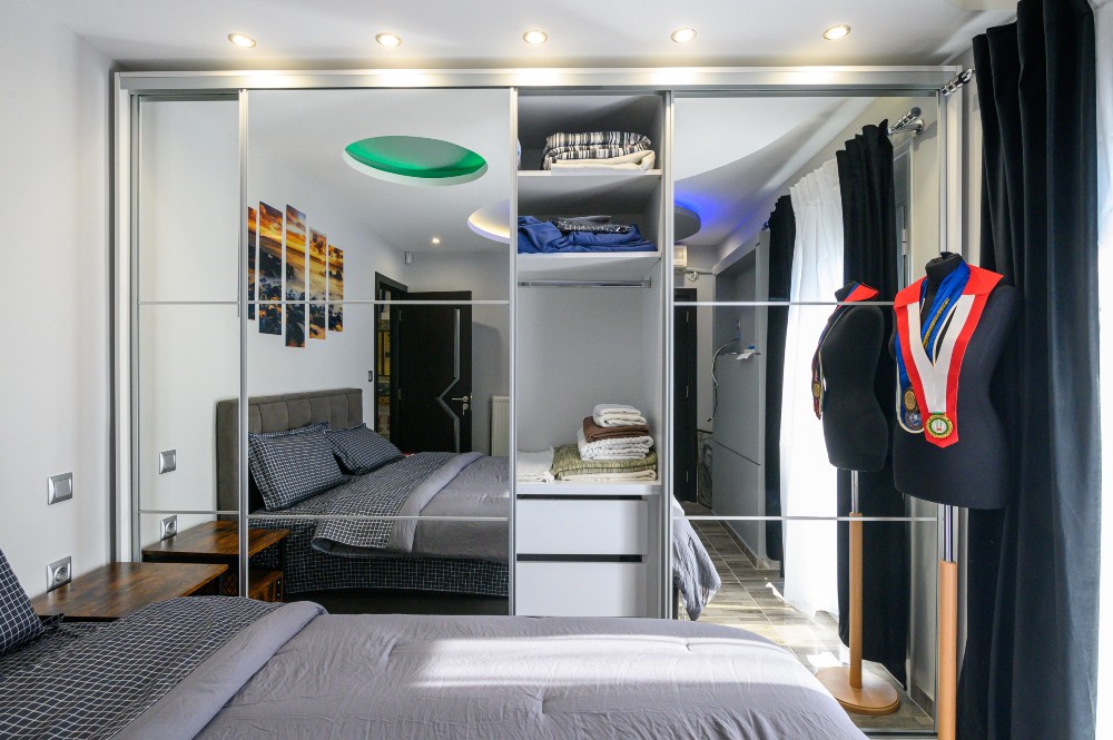 It opens and closes with sliding doors, with brake mechanisms, absolutely necessary in this wardrobe, as the doors are lined with mirrors, thus ensuring maximum safety!