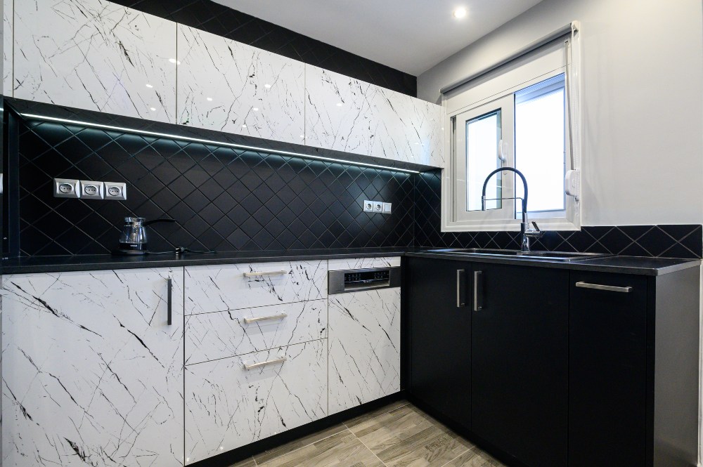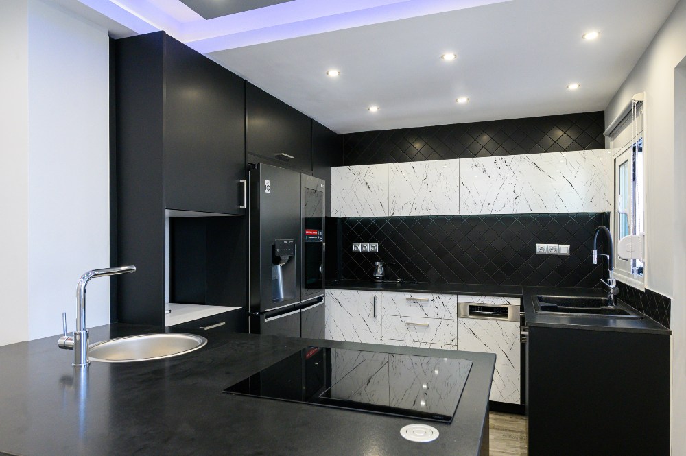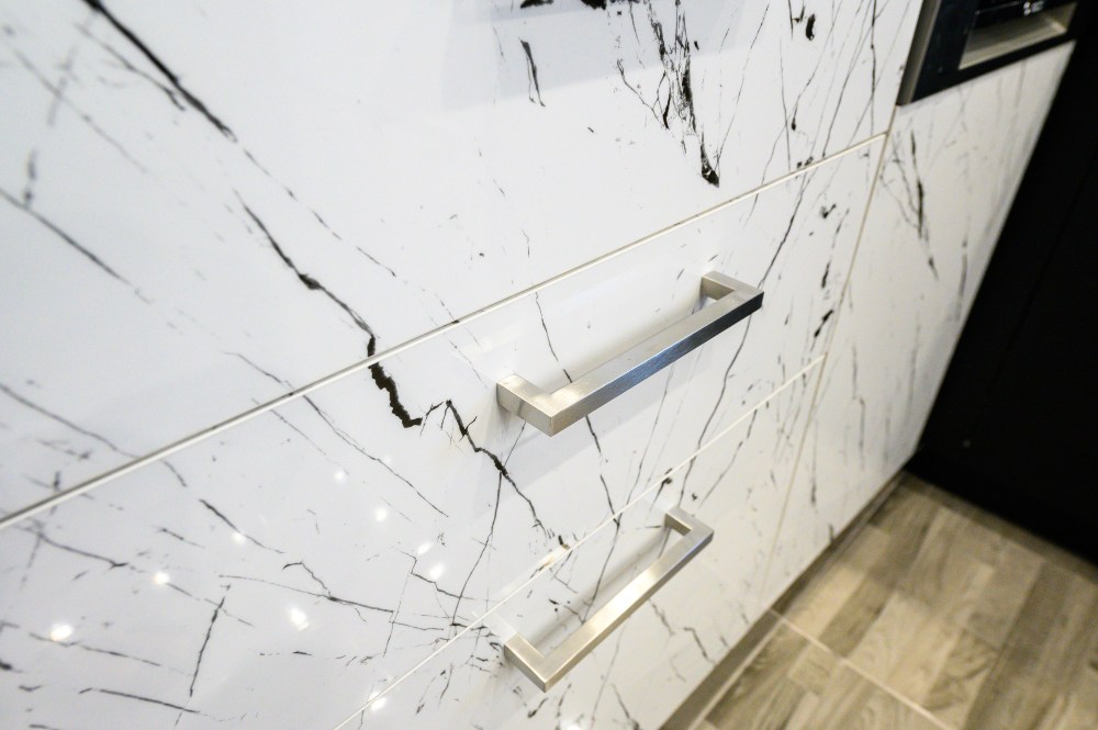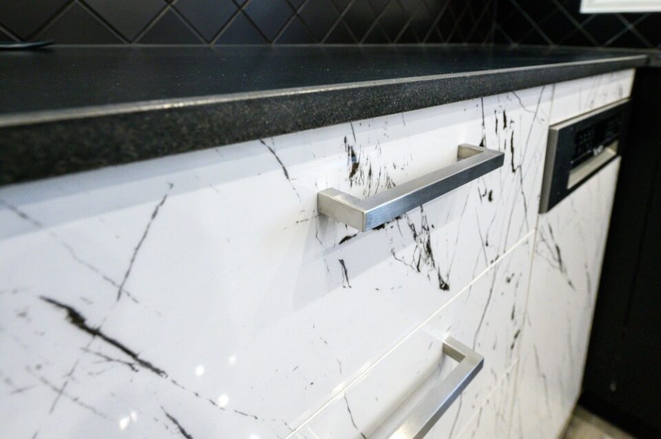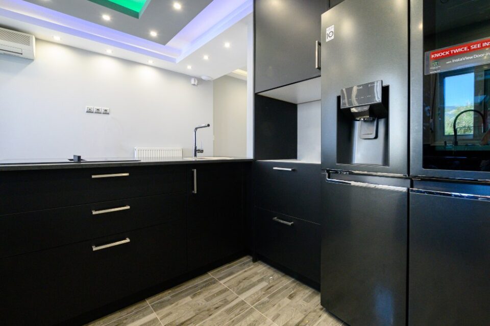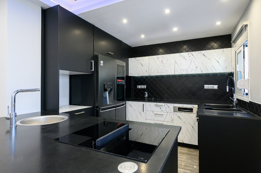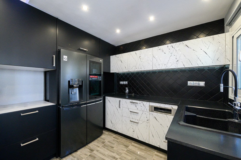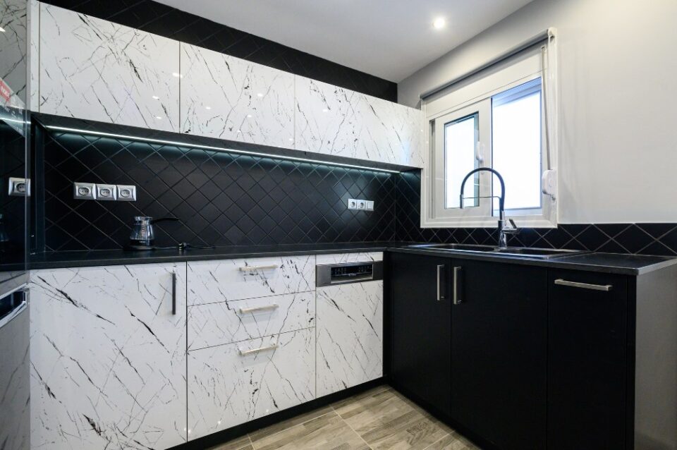 • The kitchen doors are made of PVC/PET acrylic panels (new generation bakelite) with hdf filling. The white doors have a super gloss look, while the black ones have a matte look.