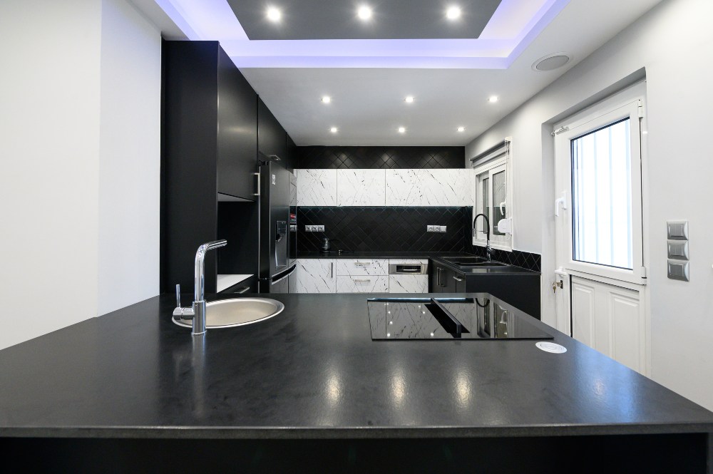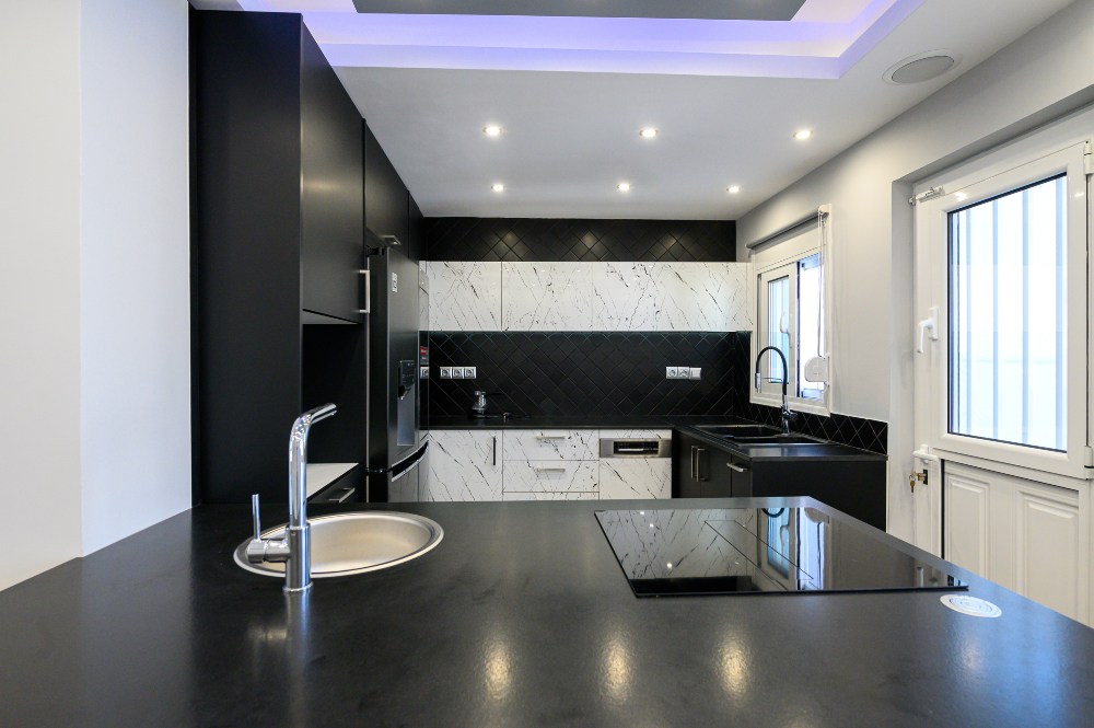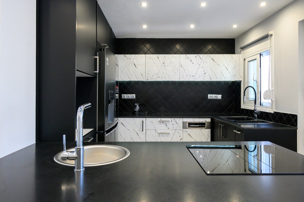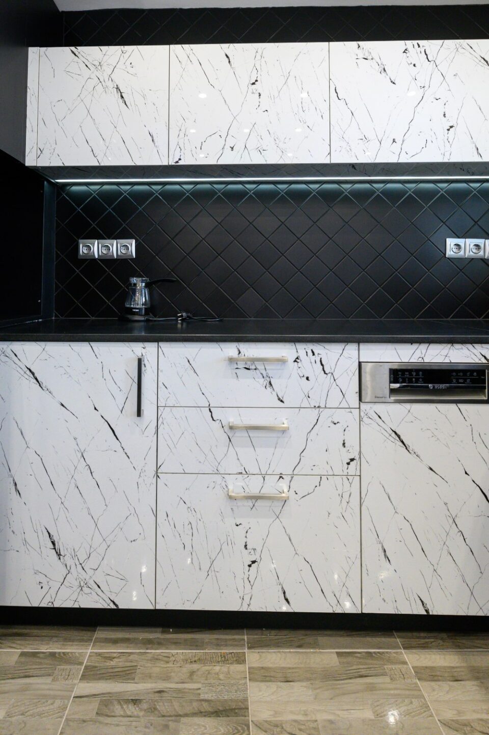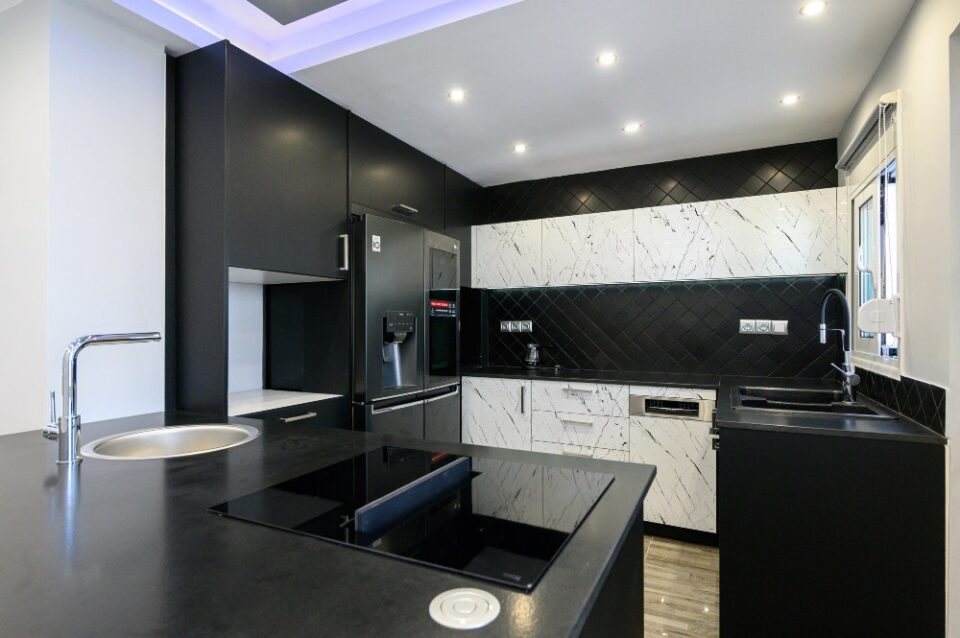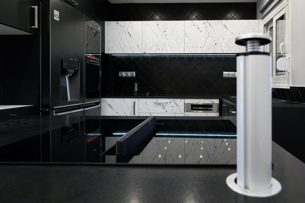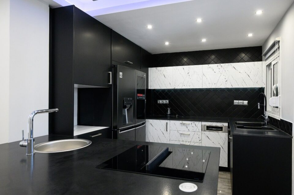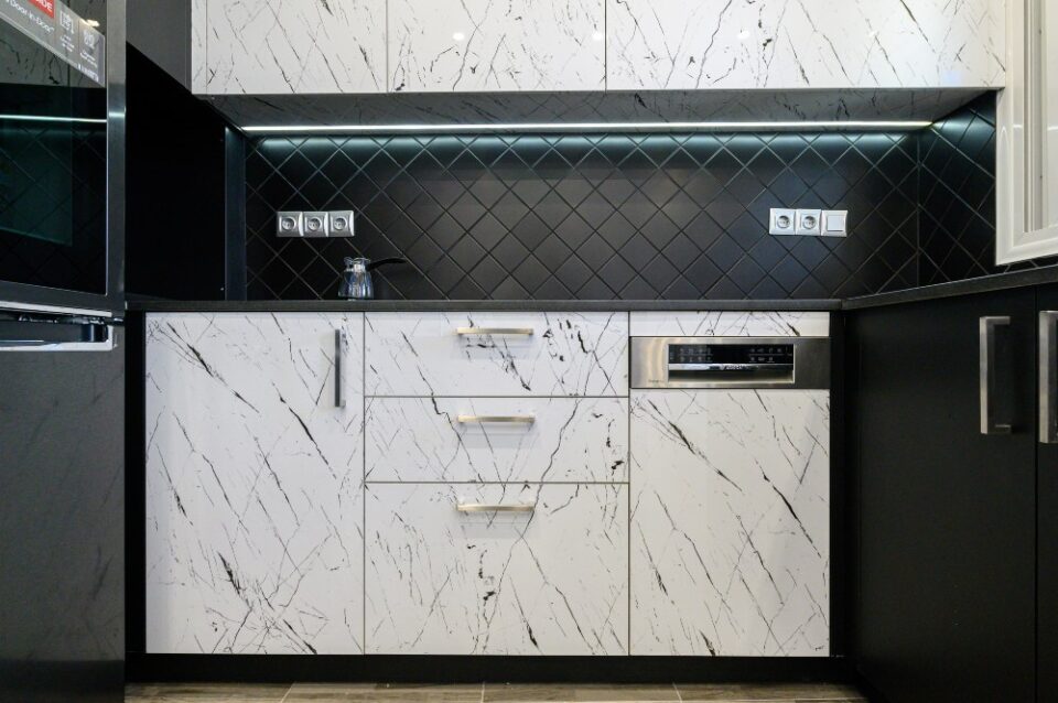 • The kitchen doors are made of PVC/PET acrylic panels (new generation bakelite) with hdf filling. The white doors have a super gloss look, while the black ones have a matte look.