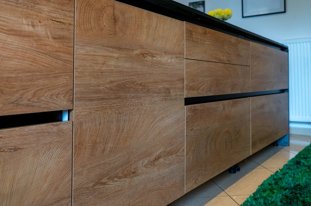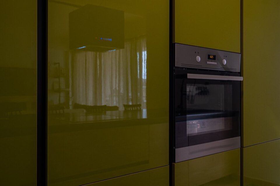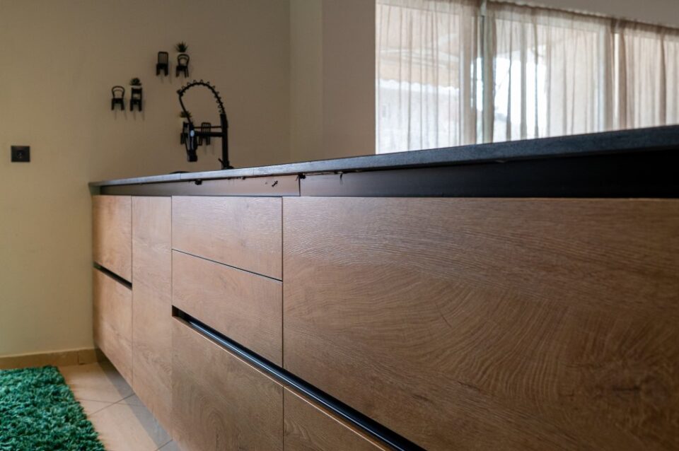 Πρόκειται για μία κουζίνα χωρίς καθόλου πόμολα αλλά με κομψές χειρολαβές τύπου GOLA που ΄΄κρύβονται΄΄ διακριτικά μέσα στα ντουλάπια!