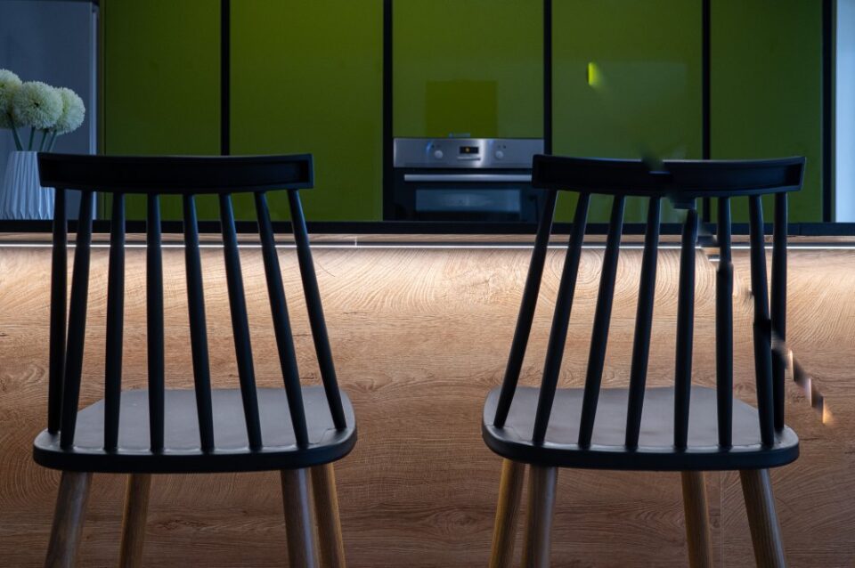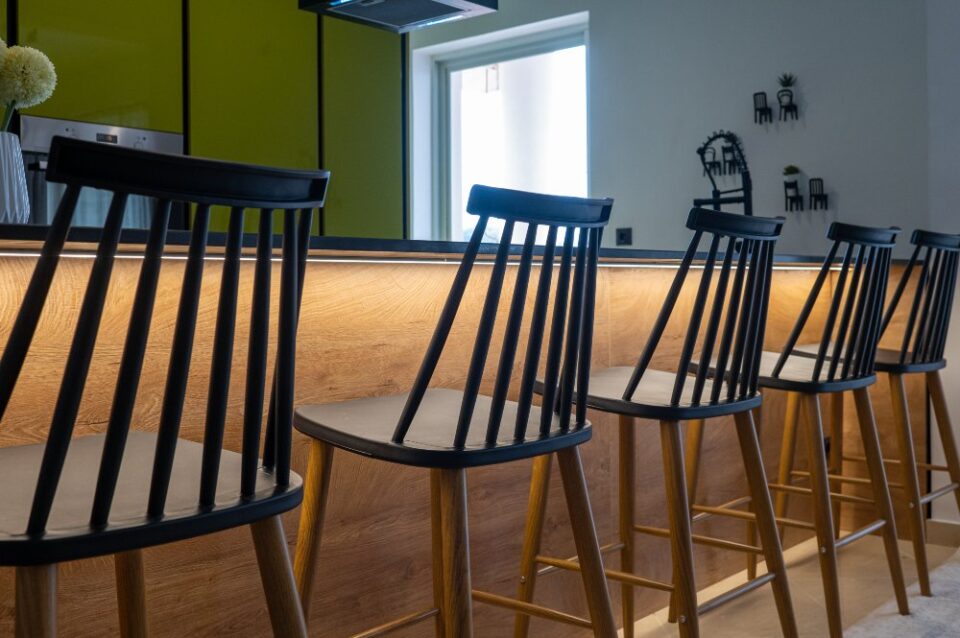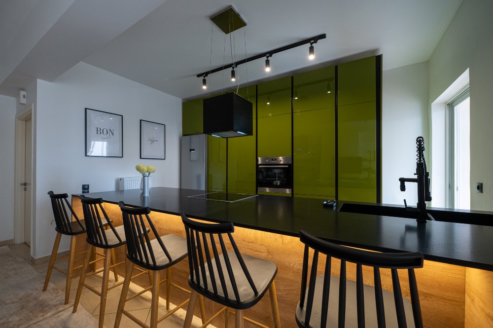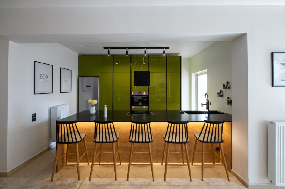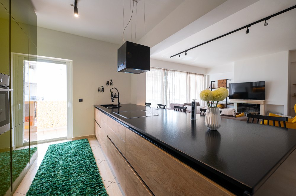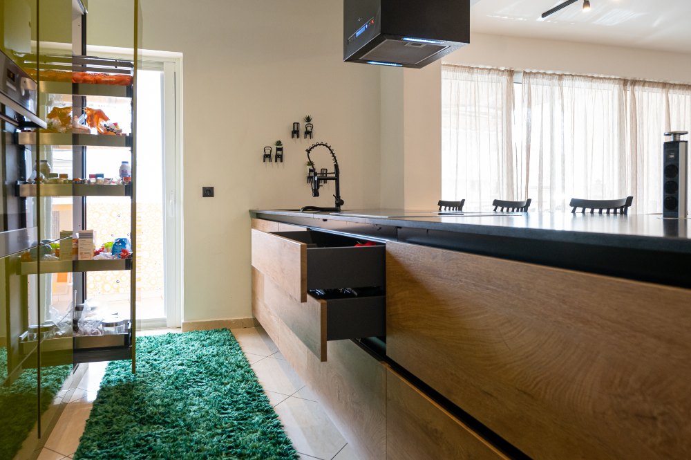 Κατασκευασμένη από φυσικό γρανίτη και στην εξωτερική της πλευρά είναι επενδεδυμένη με ξύλο δρυς. Ο νεροχύτης είναι ειδική κατασκευή από τον ίδιο γρανίτη ώστε να δίνει την αίσθηση ότι αποτελεί συνέχεια του πάγκου.Εργονομική τροφοθήκη, συρτάρια με soft close μηχανισμούς, τηλεσκοπικός πύργος με θύρες ρεύματος και usb και απορροφητήρας ενεργού άνθρακα είναι οι λεπτομέρειες που κάνουν αυτή την κουζίνα το αγαπημένο δωμάτιου του σπιτιού.