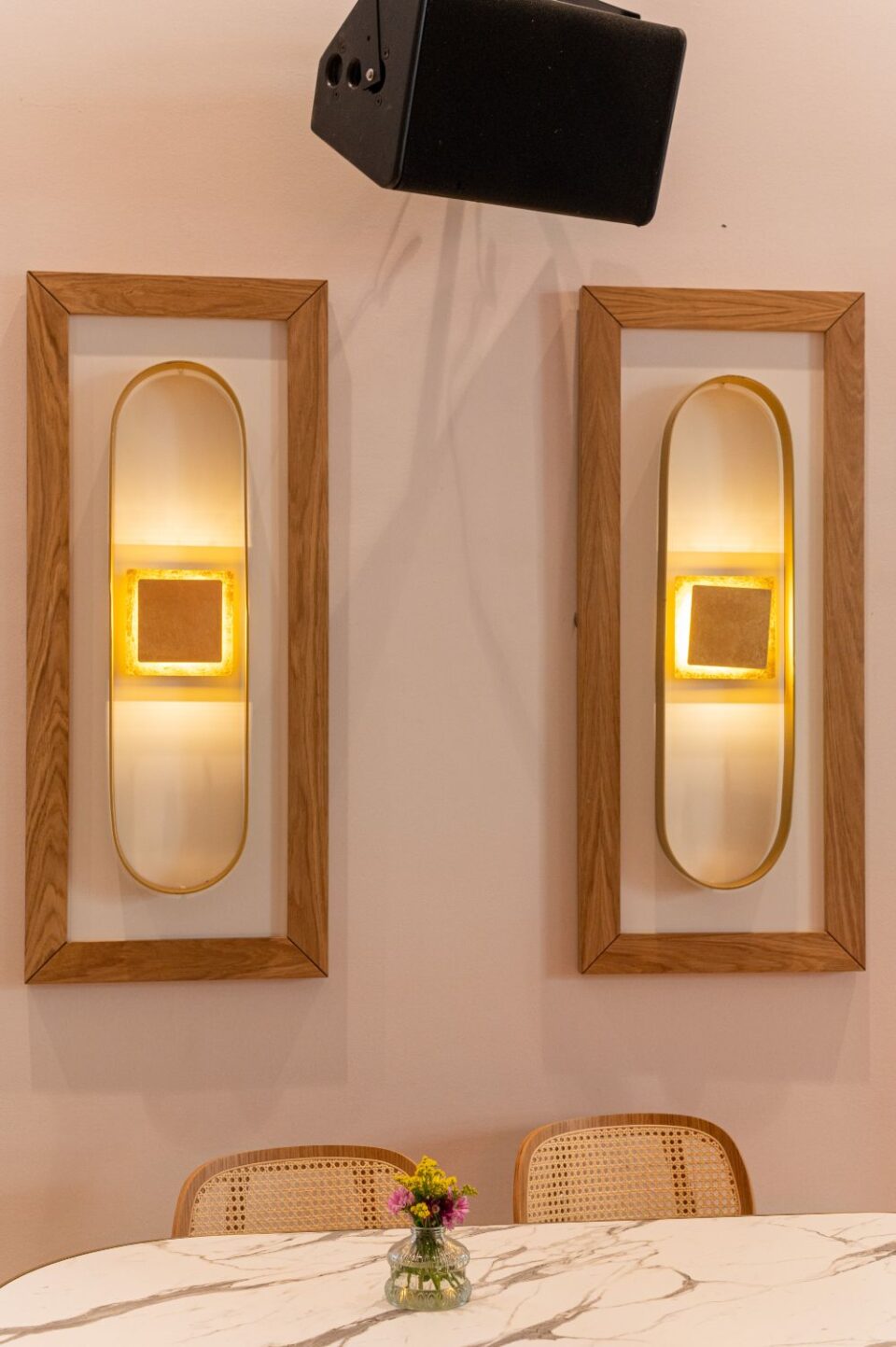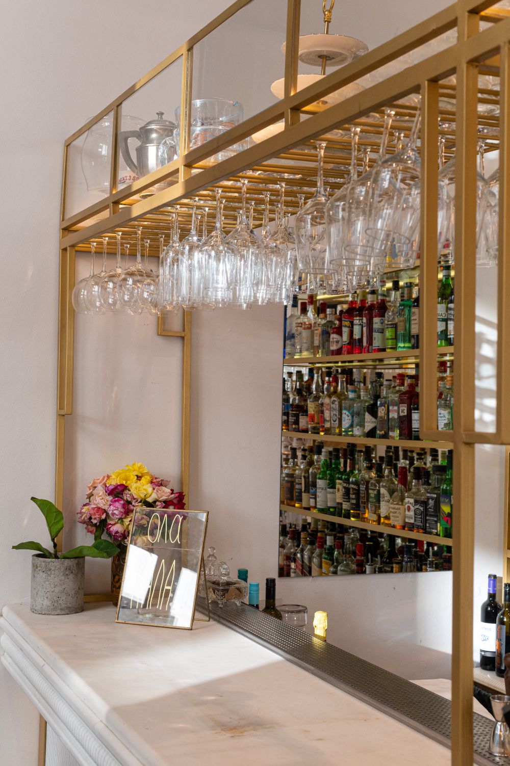 Η ξύλινη μπάρα με έντονα διακοσμητικά- επίσης ξύλινα- στοιχεία ‘’τρέχει’’ σε όλο το μήκος του κάτω ορόφου, εμπλουτισμένη με μεταλλικά στοιχεία σε χρυσή απόχρωση δίνουν την φινέτσα που η καταξιωμένη διακοσμήτρια επιθυμούσε σαν αποτέλεσμα! Οι καμάρες, το έπιπλο της ανοιχτής κουζίνας και τα χειροποίητα κάδρα στον τοίχο, συνθέτουν ένα σκηνικό απαράμιλλης πολυτέλειας!