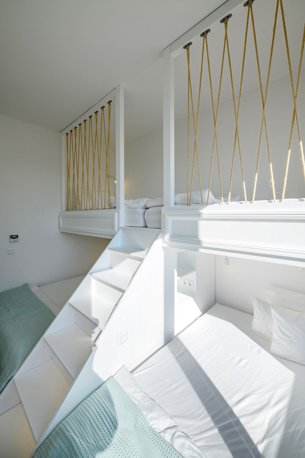 The bedroom that stands out is the children's, with the innovative construction of the bed, as it can be used in many ways: