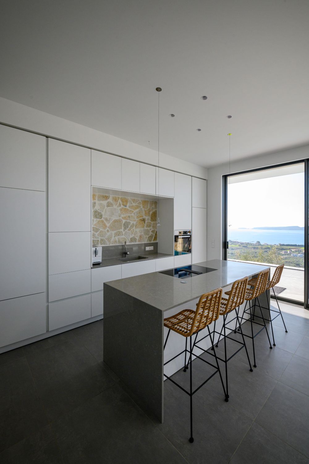Crossing the main entrance and entering the house, the first thing you see is the comfortable and ergonomic kitchen with a modern design and innovative combinations of materials.